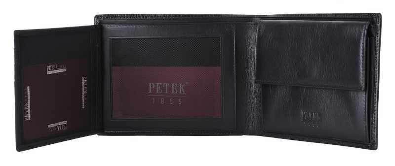 В портмоне предусмотрены два отделения для банкнот любой валюты и номинала. Справа расположена монетница, закрывающаяся на кнопку. Слева, на отгибающемся блоке имеются три прорезных кармана для кредитных карточек, а под ними два отделения для документов из прозрачной прочной сетки.
