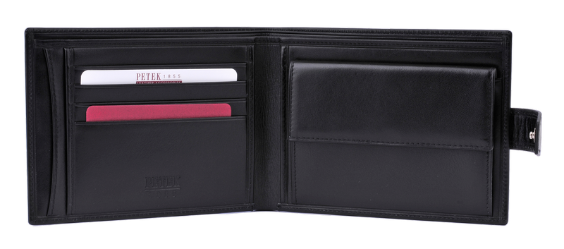 В портмоне имеются два отделения для купюр. Справа расположена монетница, которая закрывается на кнопку. Слева находятся прорезные карманы для кредитных карточек, расположенные друг над другом, в количестве четырех штук, а под ними еще два дополнительных боковых кармана.
