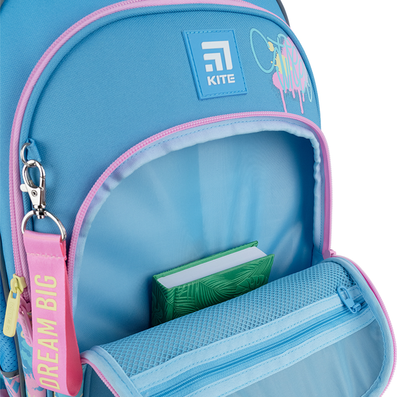 Ортопедична спинка Ergo Kids, нагрудний знімний ремінь, 2 відділення., 1 передня та 2 бічні кишені, кишеня для телефону, кишеня для планшета, внутрішні розділювачі для підручників, органайзер, ключниця, кишеня для пляшечки, надійні замки і фурнітура, світловідбиваючі елементи, кольорова підкладка, поле для персональних даних, ущільнена ручка, ручка-петля, посилене дно, брелок-підвіска із тасьми, 3D друк, знімний гаманець на карабіні